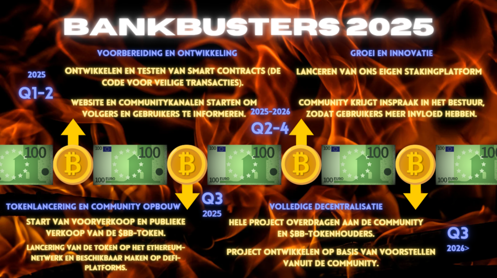 Bankbusters wil de community een duidelijk beeld geven van wat onze plannen zijn de komende paar jaar. Dit hebben we verwerkt in een duidelijke roadmap. We zullen in 2025 starten met het ontwikkelen en testen van de smart contracts, ook zullen we de website online zetten en verschillende sociale media gaan uitrollen voor de marketing. Vervolgens gaan we starten met een voorverkoop van onze munten en daarna zullen we hem ook daadwerkelijk gaan lanceren en laten toevoegen aan exchanges. Wanneer we een goede naam hebben opgebouwd naar aanleiding van onze lancering is het de bedoeling om ook ons eigen staking platform te gaan lanceren. Ook krijgt de community meer inspraak in verschillende beslissingen. Ten slotte is het uiteindelijk de bedoeling dat de community volledige inspraak krijgt in het project. Hier hebben we voor gekozen, omdat het anders mogelijk is dat er een te grote machtskloof zal ontstaan tussen Bankbusters en haar community, om dit te voorkomen. Hebben we dus besloten om Bankbusters in Q3 2026 over te dragen aan de community. We hebben deze informatie voor de komende paar jaar duidelijk verwerkt in de roadmap van ons project. Zie de roadmap op de volgende pagina: